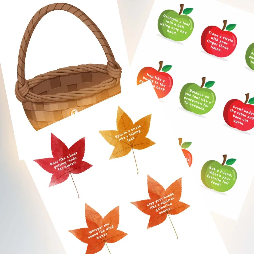 Leaf cards can be “wild cards” with silly prompts like: “Spin like a falling leaf,” or “Whisper the word ‘pumpkin.’”